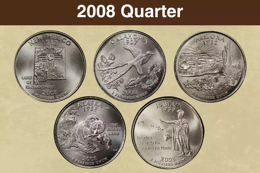 Each year from 1999 through 2008, the U.S. Mint released five new quarter designs. States appeared in the order they ratified the Constitution or joined the Union. This systematic approach meant that 2008 naturally featured the final five states admitted to statehood.