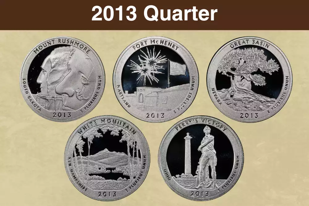 The 2013 Beautiful quarter series brought five commemorative designs to circulation: White Mountain, Perry’s emorial, Great Basin, Fort McHenry, and Mount Rushmore.